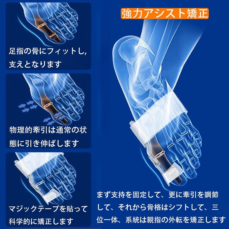 - 【外反母趾対策】:足親指外反母趾ステントは人体工学設計を採用し、足親指関節、足底、かかとが三位一体となって、 足底を通じて固定した後、2段のバンドマジックテープで固定し、足親指を外に引っ張り、骨格を正常な位置に調整し、最後 にかかとを巻きつけることで2回目の補強と延伸を行い、正常な足に導く。