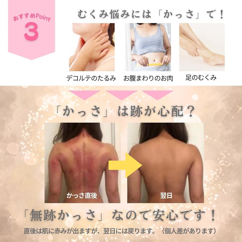 - 【理学療法士監修】当製品は、理学療法士が臨床試験を繰り返し、合格した商品です。東洋医学に基づき開発された伝統的なかっさによって、痕が消えやすくなっております。