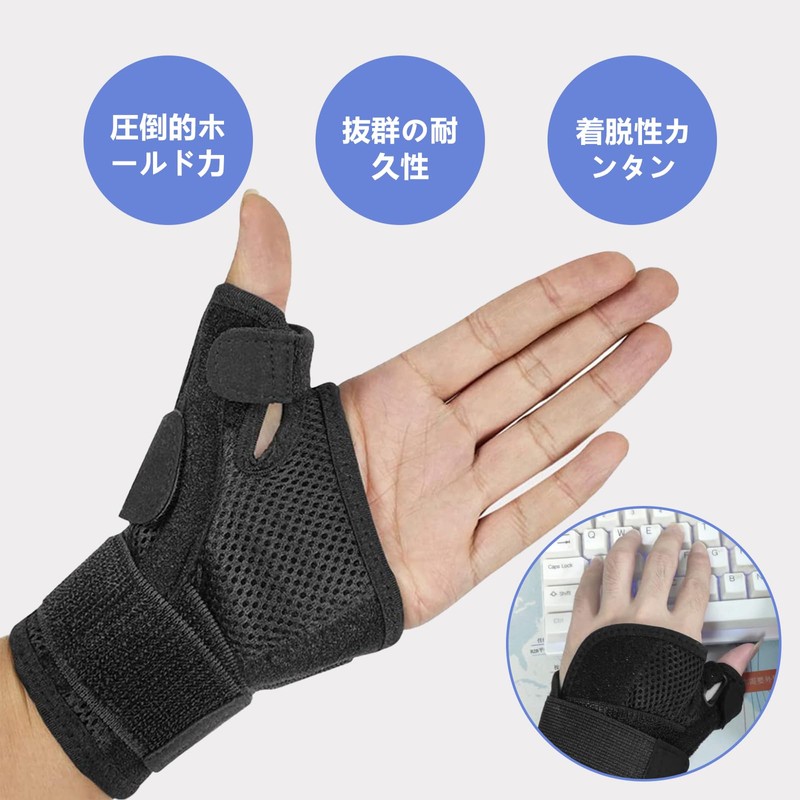 - 【柔軟な添え木】色々な原因で起こる親指の痛み、パソコンの長時間作業で腱鞘炎に、家事育児で親指と手首が痛い。親指付け根サポーター左右兼用でどちらの腕にも簡単に装着や取り外しができます。男女兼用、指先フリーで作業がしやすい、通気性の良いメッシュ素材。