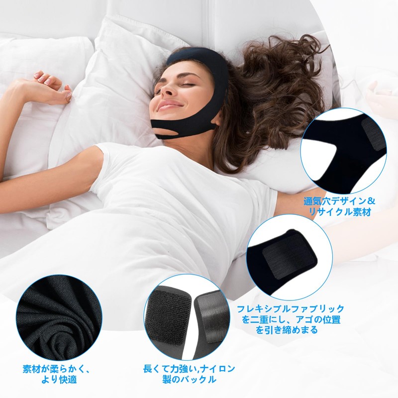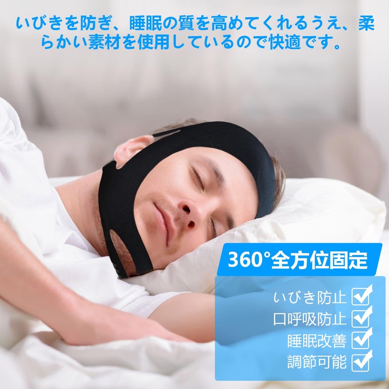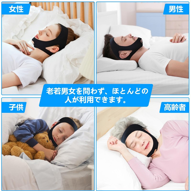 いびき防止グッズ 顎固定サポーター いびき防止サポーター 鼾防止グッズ 鼻呼吸 いびき軽減グッズ 口呼吸防止 調節可能 無臭 肌にやさしい 通気性 しっかり固定 いびき改善 睡眠補助 男女兼用 (ブラック)