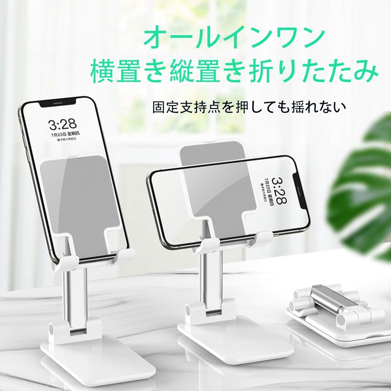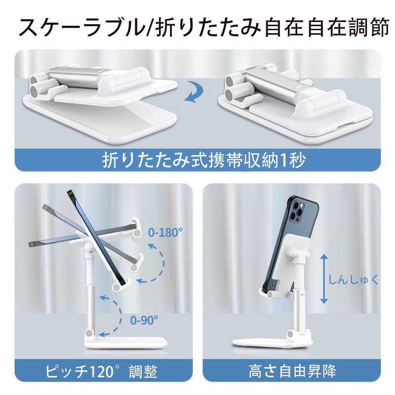 スマホスタンド コンパクトで持ち運びに便利 白 折りたたみ伸縮性 マルチアングル調整 フリーリフト すべりどめ 水平/垂直 各種携帯電話のタブレットサイズを適用