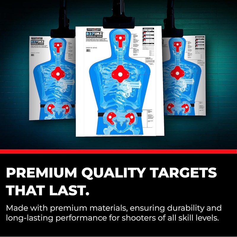 Fusing immobilization zone mapping with the widely recognized B27, we have produced the next generation in law enforcement and military training targets. What sets Thompson's B27-IMZ full-torso target above the rest is the first-of-its-kind break-through design. The assailant's key immobilization zones are superimposed against the skeletal structure for effective comprehension in extreme response and immobilization training. The detailed scoring zone meets tactical training specifications, and each immobilization zone is mapped out with measurements and specialized teaching to improve understanding of shot placement and its effect.
