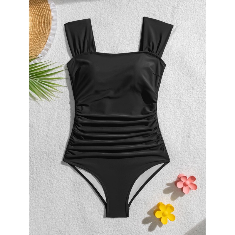 - Features: Wide shoulder straps, square neck, high straight back cut, push up, ruched. The one piece bathing suits feature retro style, it is fit for all the stature and very comfortable to wear and swim in
