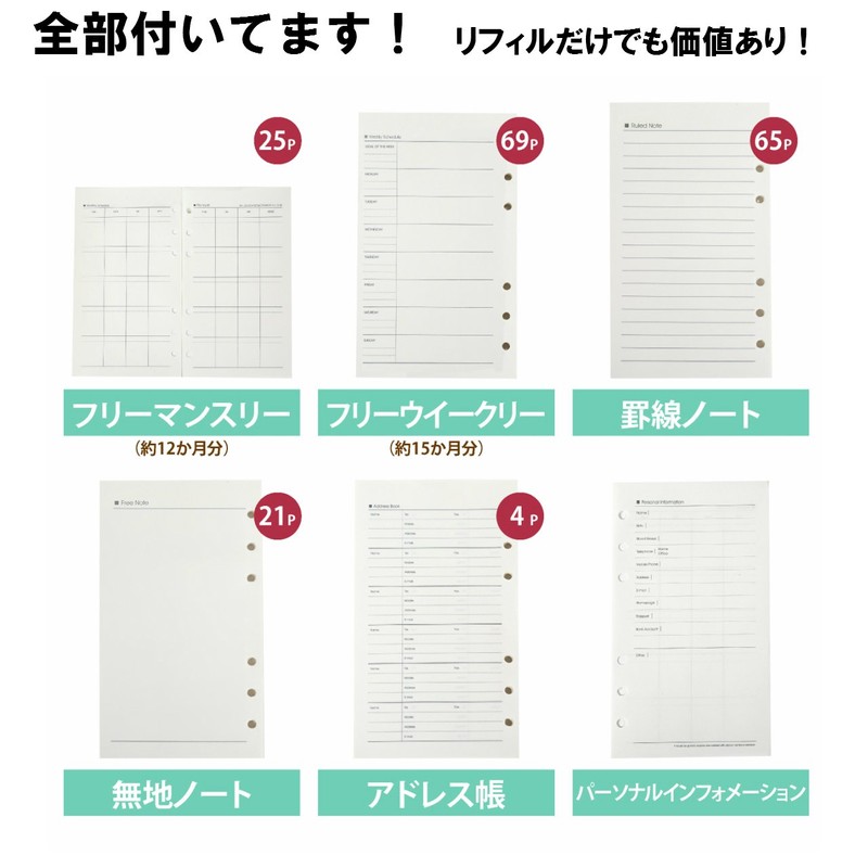 - Refill Contents: 6 color indexes, 6.3 inches (16 cm) ruler, 4 color notes, Underlayment, Clear pocket, Freemance 25P (12 months supply), Free Weekly 69P (about 15 months supply), Ruled Notebook, 21P Plain Notebook, 4P Address Book, Personal Information