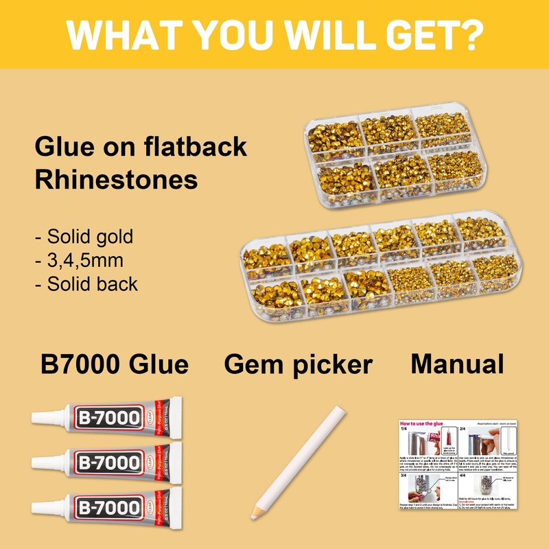 B7000 Gem Glue on 7500Pcs Gold Rhinestones Flatback for Crafts Clothes Decoration Clothing Fabric,Bright Metallic Gold Plated Flat Back Crystals for Crafting Costumes,Gluefix Bedazzling Kit 2/3/4/5 mm