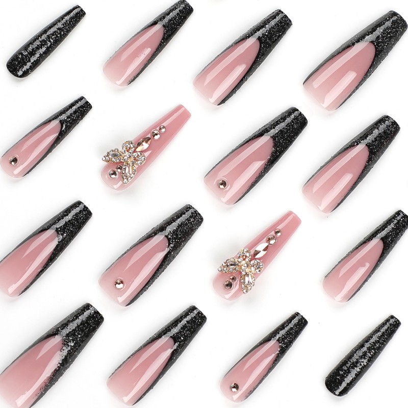 BABALAL Press on Nails Long Coffin Fake Nails Black French Tip Glue on Nails Butterfly Charm Luxury Acrylic Nails Glitter Bling False Nails 24Pcs Manicure Glossy Squoval Artificial Nails