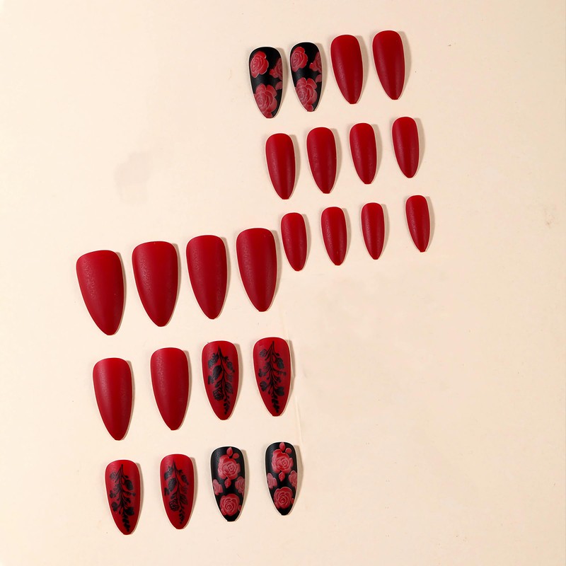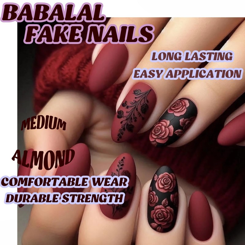 BABALAL Press on Nails Medium Almond Fake Nails Burgundy Red Glue on Nails Black Rose Design Coquette Acrylic Nails Wine Red False Nails Manicure Stick on Nails 24Pcs Stiletto False Nails