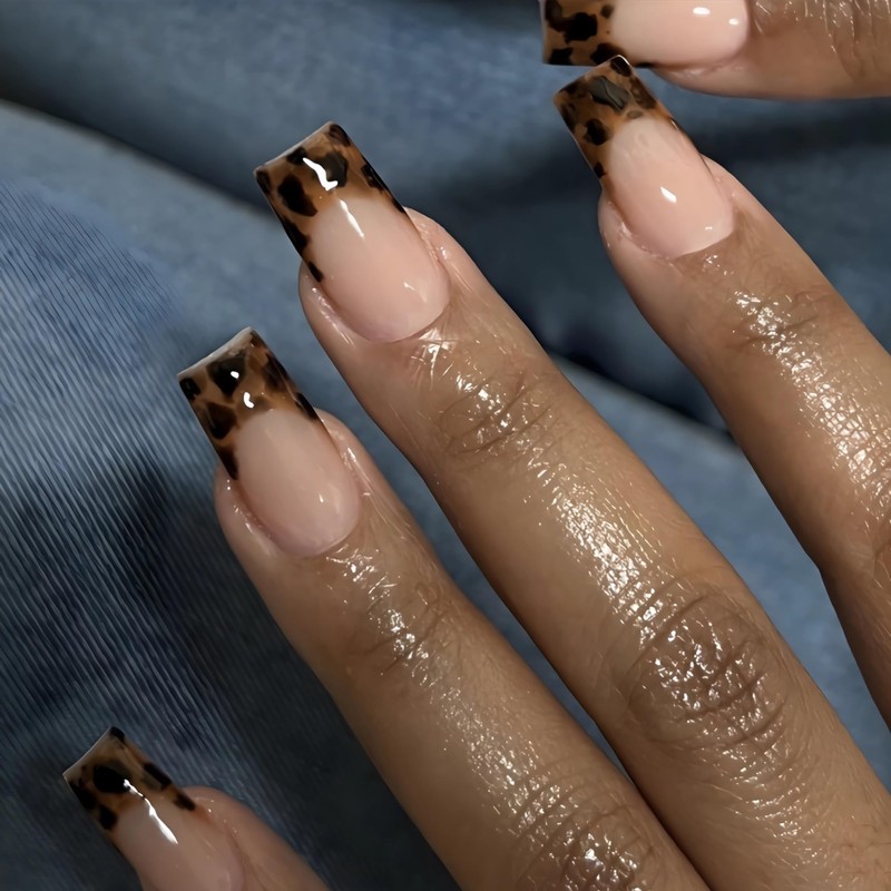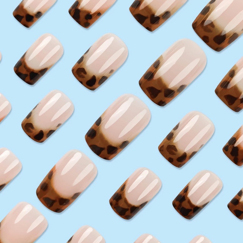BABALAL Press on Nails Medium Square Fake Nails French Tip Brown Fall Nails with Glue Cheetah Print Design Acrylic Nails 24Pcs Squoval Manicure Artificial Nails Glossy Stick on Nails