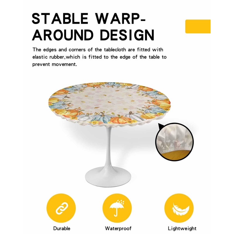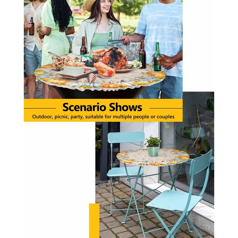 - High Quality & Durable: This round fitted tablecloth is made from high-quality super stretchy polyester fabric with wrinkle-free design that has strong durability. Each package includes 1 thanksgiving pumpkin sunflower and botanical maple leaves pattern tablecloth. Available three sizes. Fits up to 36"-44"; Fits up to 45"-54"; Fits up to 55"-60". Please measure the table diameter of your table before purchasing to ensure that the table cover fits perfectly.