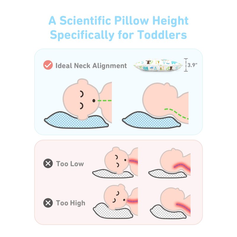 - Pediatricians First Recommended - Consider toddler's spine in a development stage, our scientifically designed toddler pillows for sleeping from 2 to 5 years old, suitable thickness and size for the best spinal support to make your kids sleep better and grow healthily