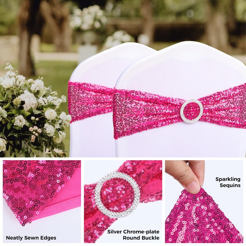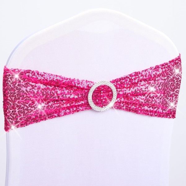 Babenest 10pcs Sequin Chair Sashes with Buckle Slider, One-Sided Sequins Stretchy Spandex Bands, Glitter Elastic Chair Ties for Wedding Party Ceremony Banquet Decorations (Magenta)