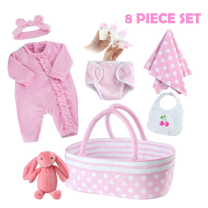 - 【PACKAGE INCLUDE】Our 8 pcs reborn baby dolls clothes set come with 1*pink dot bassinet,1*pink onesie,1*diaper,1*bib,1*plush toy,1*towel,1*baby hat and 1*bottle of total 8 accessories able enhance the play experience for children.