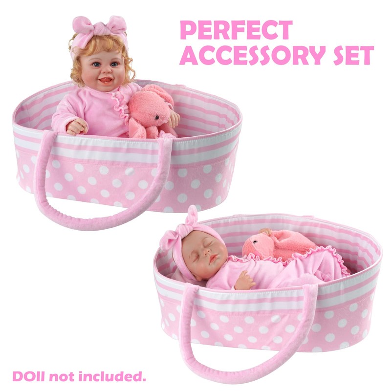 - 【DOLL BASSINET】The pink dot design baby doll clothes accessory bassinet which is easy to carry,durable,and has a large space,which can hold dolls and clothing accessories,so that makingit easy for kids to play everywhere.