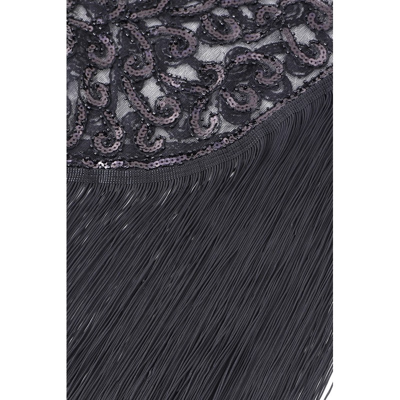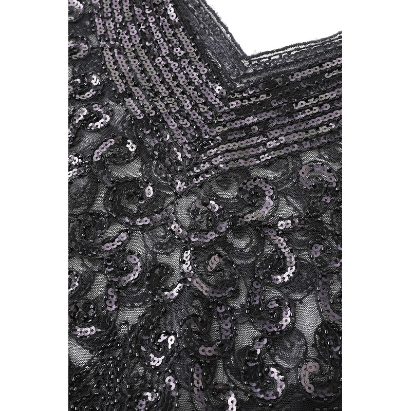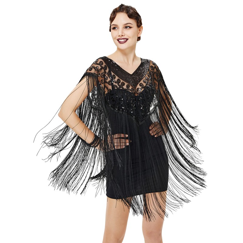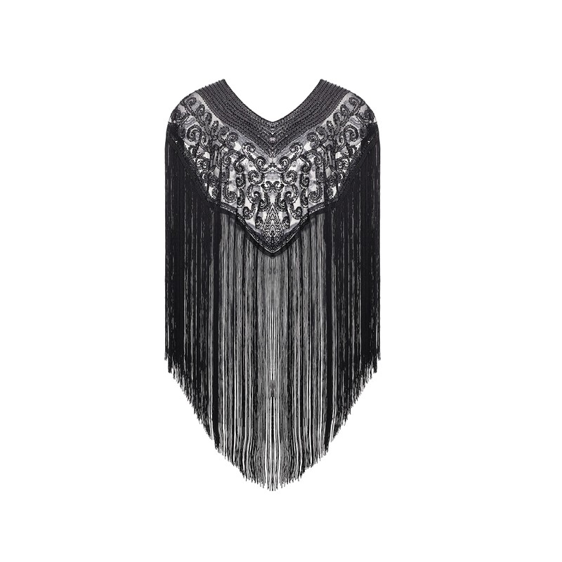 - The biggest highlight of this shawl is the delicate vintage embroidery and long fringes with glittering sequins and classic black and gold, making you look like an elegant noblewoman from a 20th century pictorial. The V-neck design visually illuminates your curves and goes better with the flapper dress.