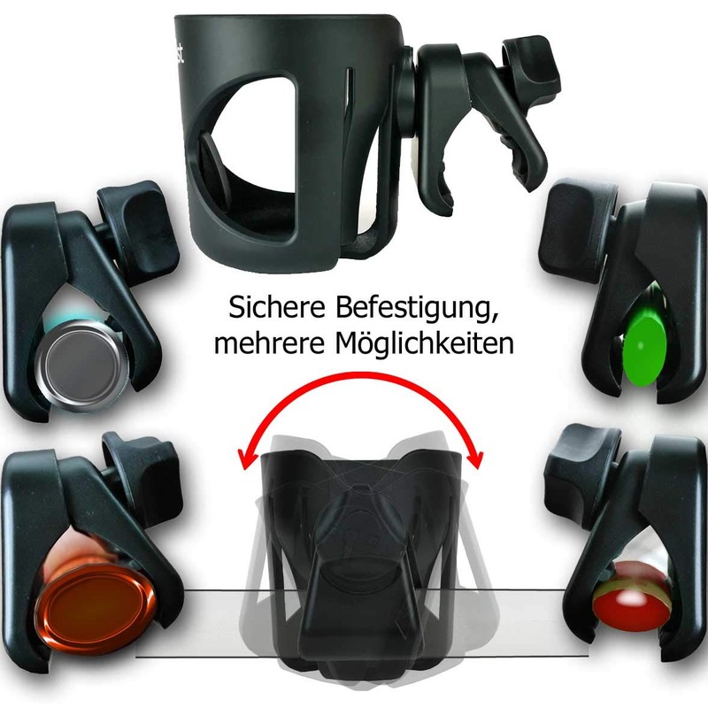 Cup holder is a real all-rounder, with diameter 7 cm (bottom) and up to 8.5 cm (top, height 10 cm) it is suitable for cups, coffee cups (e.g. Grande), drinking bottle, baby bottles, 0.5 L water bottle or beer can. It is not only recommended as a bottle holder pram and buggy, but also as a wheelchair accessory.