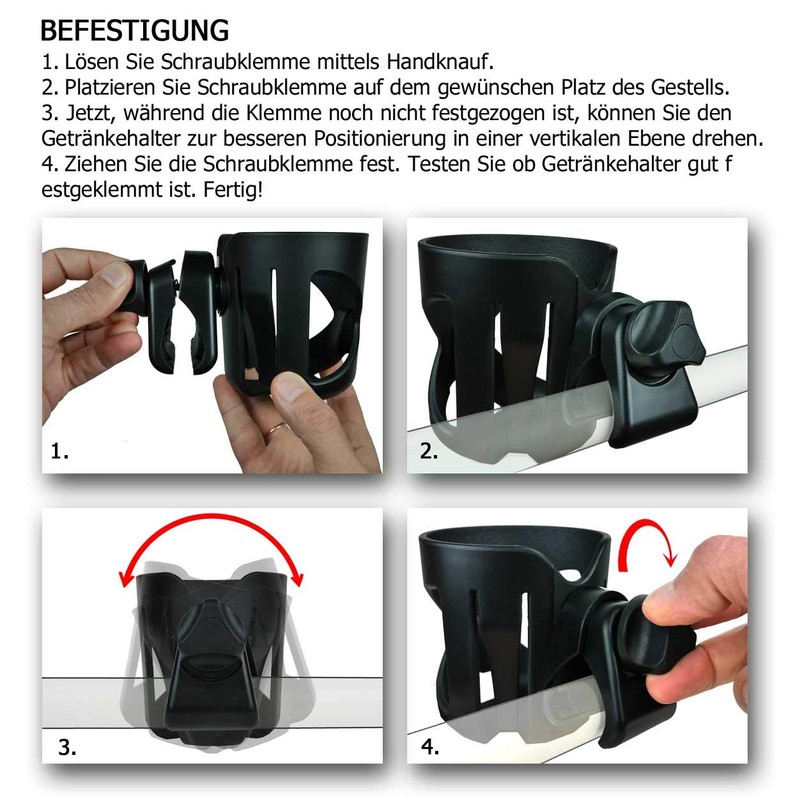 Drinking is important, but with baby on the go is sometimes complicated. Where to go with a cup, bottle, beer? Our cup holder is the solution for all pushchairs, buggies, wheelchairs and all common to-go drinks and baby bottles. Free your hands for your baby, feel relaxed and safe at the same time.