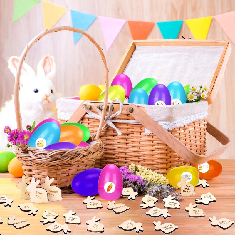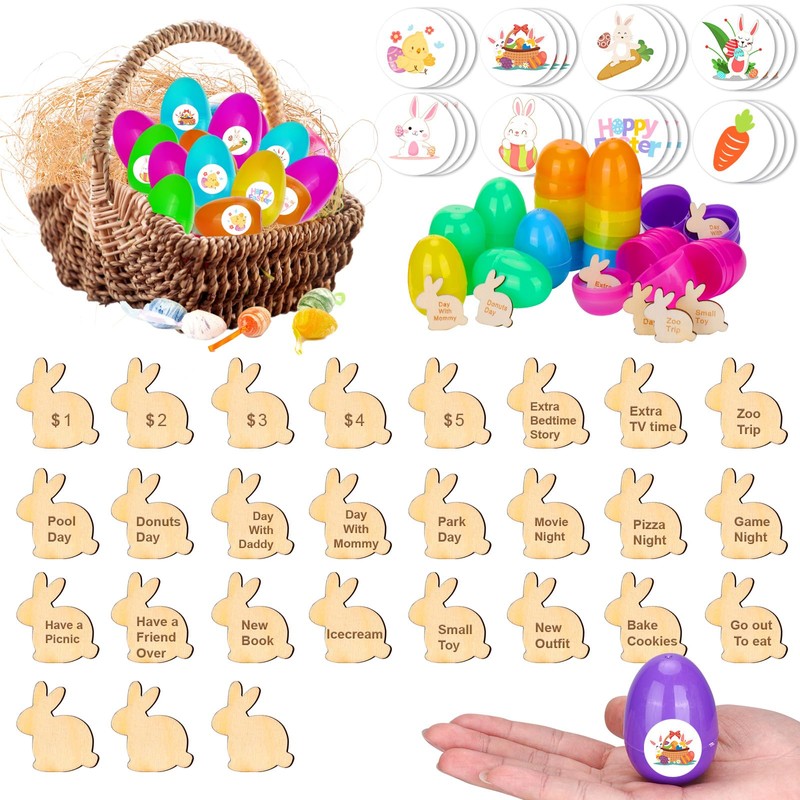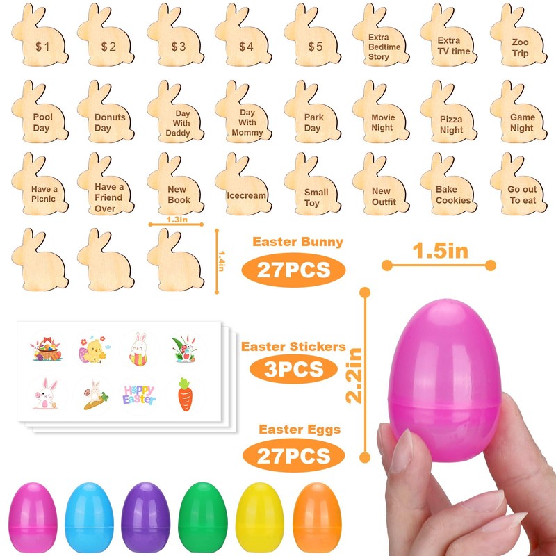 - Easter Egg Tokens for Kids: The easter eggs tokens set includes 27pcs easter eggs, 27pcs bunny wooden tokens, 32pcs easter stickers, perfect for adding a personal touch to your Easter egg hunt. These custom Easter egg tokens for kids can be used as fun, creative rewards during the game, making the experience even more special