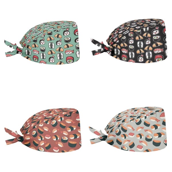 Babrukda 4 Pack Cap with Sweatband Adjustable Tie Back Hat Headgear Xmas Beanie, Sushi Stylish Pattern, One Size