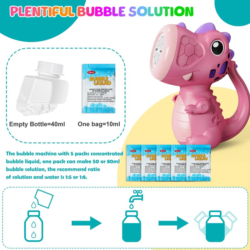 - [Portable Bubble Machine] The bubble making machine with a ergonomic handle fits well with the kids' small hand to hold comfortably, it can handheld also place on the flat surface for bubbling fun, easy for kids take to the patio park garden yard or anywhere. Included 5 packs concentrated bubble liquid, one bag can make 50 or 80ml bubble solution, plentiful bubble solution provide a continuous great bubble time.(Tips: the recommend ratio of solution and water is 1:5 or 1:8).