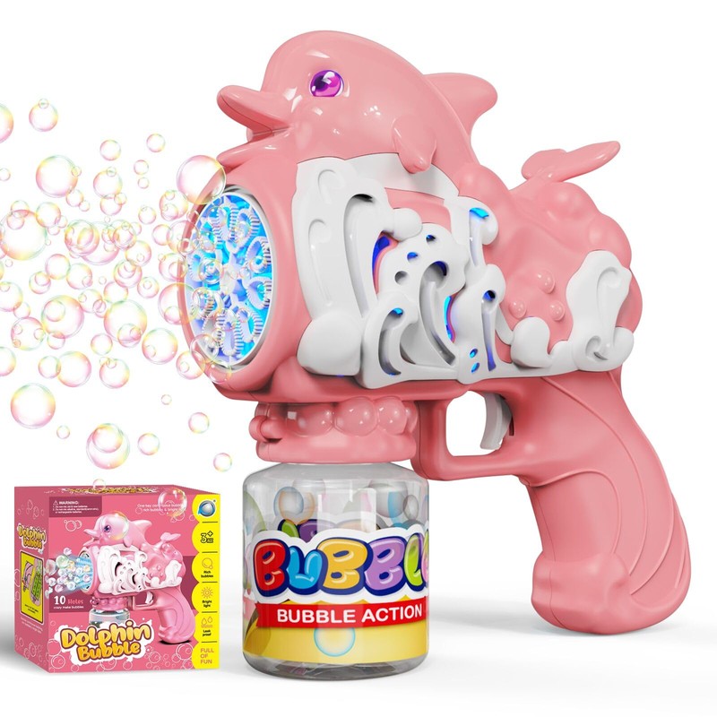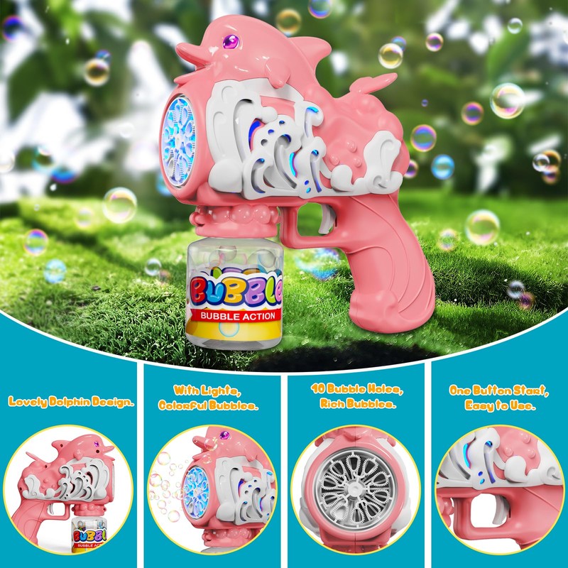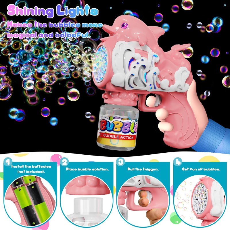 - [Dolphin Bubble Gun] Our bubble gun with a lovely dolphin looking, the adorable design is loved by all aged of kids, and increase the interesting for the children outdoor in the dreamy bubble world. Well, let your little kids go wild, and enjoy the endless fun from this bubble machine.