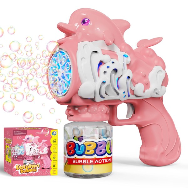 Babuloo Dolphins Bubble Gun for Kids, Portable Bubble Machine 10000+ Bubbles Per Minute with Bubble Solution, 10 Holes Automatic Bubble Blower Gun with Lights for Outdoor Party Wedding, Pink