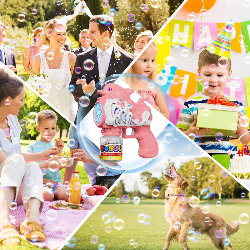 - [Joy of Rich Bubbles] The bubble gun with a powerful motor and 10 bubble holes that can produce 10000+ colorful bubbles every minute, a constant stream of colorful bubbles fly to air faster and higher, and children are excited to chase the bubbles in this fun bubble world, filled with laughter and happiness. Built-in glowing light make the bubbles visible and magical even at night, provide entertainment day and night, suitable for all ages of kids.