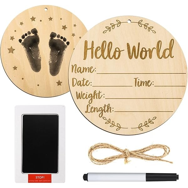 Baby Announcement Sign, 5.9 Inch Round Baby Nursery Name Signs with Ink Pad for Baby Hand and Footprints Wooden Hello World Newborn Sign for Photo Prop