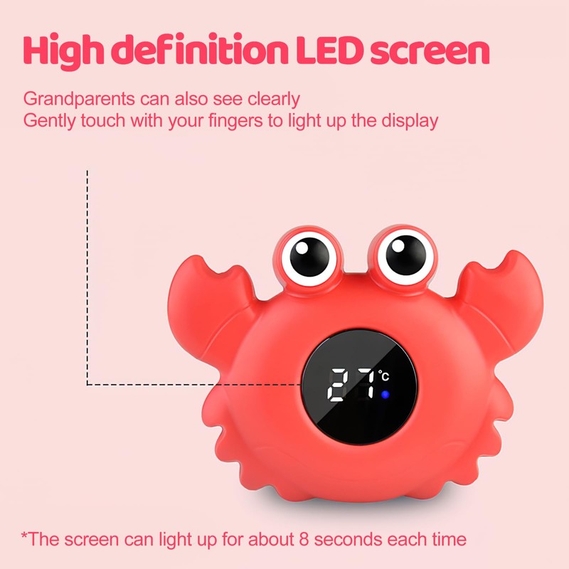 • Monitor the water temperature, enjoy optimal water temperature: our bath thermometer has the shape of a cute crab and can be used as a great bath decoration. The adorable crab water thermometer accompanies your baby's bath. The bath can be used as a water temperature monitor. Monitor and record the temperature at any time. Let your baby enjoy bathing while keeping the water at a safe temperature.