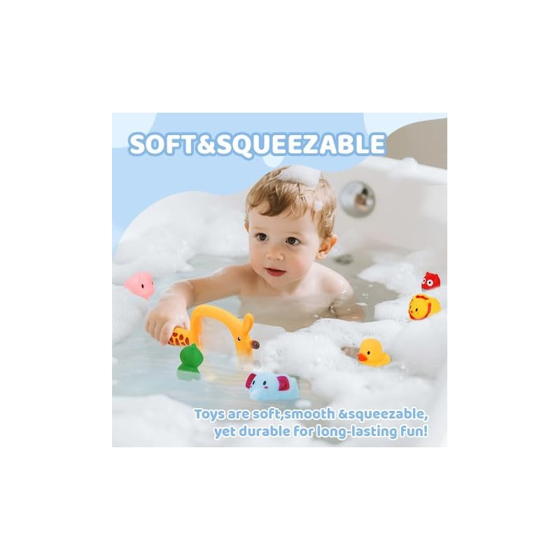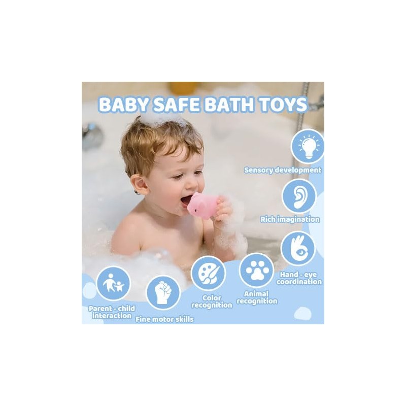 - Skills Promoting Bath Toys These animal bath toys made of soft material are easy to grip for babies. Playing with it helps develop your baby's grasping ability and hand-eye coordination. This makes bath time not only fun, but also educational.