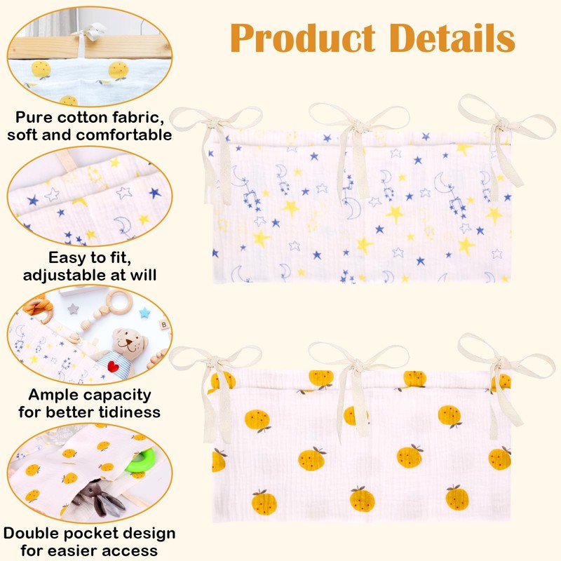 - Versatile: Our baby bed storage hanging bags are not only suitable for baby beds, but also for changing tables, prams or other areas where additional storage space is needed. They are flexible and fit perfectly with different baby equipment. An essential accessory for young parents!