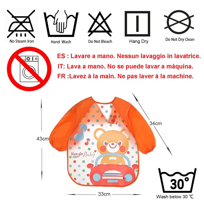- Bib with sleeves: can be used to cover clothes completely and also as a bib for artistic activities. Ideal for children who like to paint and draw, can protect them from stains on clothes. Size: 43 x 34 x 34 cm. 100% safe for your baby: BPA free bibs.