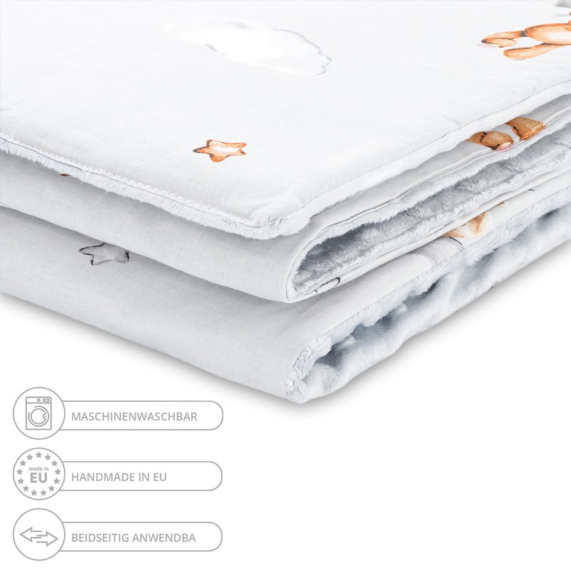 This high-quality baby blanket is the perfect companion for your newborn. The stroller blanket for newborns is made from breathable cotton material on one side and a soft, plush fabric on the other, making it perfectly adaptable to different needs. The double-sided construction ensures optimal comfort: the plush side retains heat and keeps your baby cozy in cooler months, while the cotton side allows better air circulation on warmer days, preventing excessive sweating and providing a pleasant feel on the skin. The cotton baby blanket offers the highest comfort for sensitive baby skin. Thanks to its cuddly and soft surface, it is ideal as a snuggle blanket, play mat, newborn baby equipment, or baby duvet. The stylish design and gentle colors make it a beautiful accessory in the nursery. The baby blanket is versatile – whether in the stroller, in bed, or on the go – it provides comfort and warmth everywhere. It is machine washable at 30°C, retains its shape even after many washes, and remains soft and pleasant. Perfect as a gift for a birth or baby shower, as every mother will love this high-quality baby blanket. With a size suitable for both babies and toddlers, it offers long-lasting comfort. The lint-free finish ensures long durability. Choose according to your needs: available as a set with a matching cushion (75x60 cm + 35x30 cm) or individually as a blanket (75x100 cm). In addition, the product is available in a summer or winter version. Please note: slight deviations in size (+/- 5%) may occur. Attention! The color tone may vary slightly depending on the light in the photos (natural/artificial), the material batch, or the monitor settings.