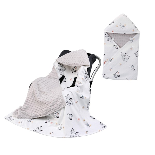 - 【SOFT & COMFORTABLE】:Carseat swaddle blanket made with two layers design,The surface material is Cotton printed fabric,sweat-absorbing and breathable.The inner layer is bean velvet,delicate and soft, soothing and smooth.Double-sided available, perfect for all season.