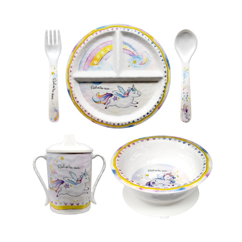 Baby Cie Kids and Baby Melamine Place Setting Sippy Cup, Suctions Bowl, Section Plate and Fork Spoon Set (REALIZE YOUR DREAMS)