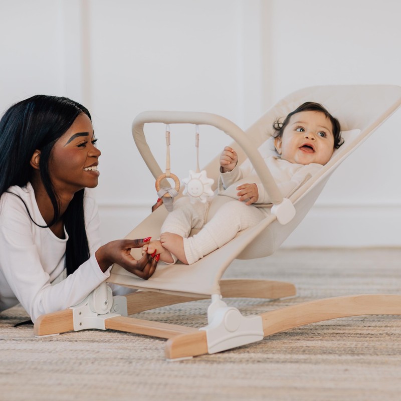 - CONSTANT ENTERTAINMENT: With its two different recline positions and detachable toy bar, your child will be comfortable and occupied in this wood bouncer. The toy bar is fitted with premium toys including a teether ring with crinkle paper and a soft toy with a rattle.