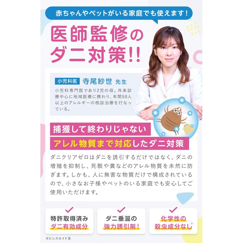 • [Important to not breed up]: This dust mites produce approximately 100 eggs per one, and become an adult bug in 25 days. If left alone it will grow tens of thousands of people. That's why it is important not only to dust mites you have, but also to keep the growth of the future. The active ingredients included in this product help to reduce 99% of the hatching and growth of dust mites eggs and block the root of breeding. By replacing them regularly you can keep your child's space clean and comfortable all year round. [Product Details] Contents Quantity: 3 pieces; Size: Sheet 3.5 x 3.5 inches (9 x 9 cm); Package 6.3 x 8.3 inches (16 x 21 cm); Estimated Use: Approx. 4 months; Made in Japan. Just place it in a place that you are concerned about to support your life. With a date seal, you can see when to change it at a glance and easy to manage. Made of natural cotton non-woven sheets. Furthermore, the bait shape will last for 4 months. Dani clear zero is hand finished one by one. In order to make your life more comfortable, this product is made of materials that are safe for you and the environment to clear the trouble of dust mites. We hope that people who suffer from dust mites can reduce the burden of them and protect the precious space of your family
