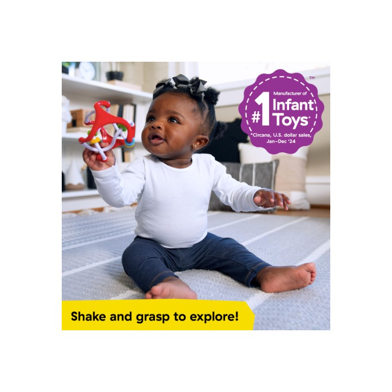 All the benefits of a bead chaser and ball in one great infant toy! Rattle, shake, & explore with the multisensory Baby Einstein Slide & Swirl Sensory Ball. This easy to grip ball’s colorful beads and twisty tubes engage the senses to help baby build fine motor skills as they slide the beads and grasp this portable, sensory toy. Shake and toss the ball to hear rattle sounds or watch the beads slide to discover cause and effect. Sized to fit in most diaper bags for on the go play, this is a great first ball for babies ages 3 months and up. Designed by the #1 Manufacturer of Baby Toys* (Circana, US dollar sales, Jan-Oct 2023). Dimensions: 3.94 x 4 x 4 inches. Wipes clean.