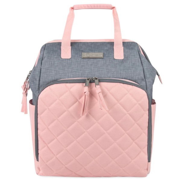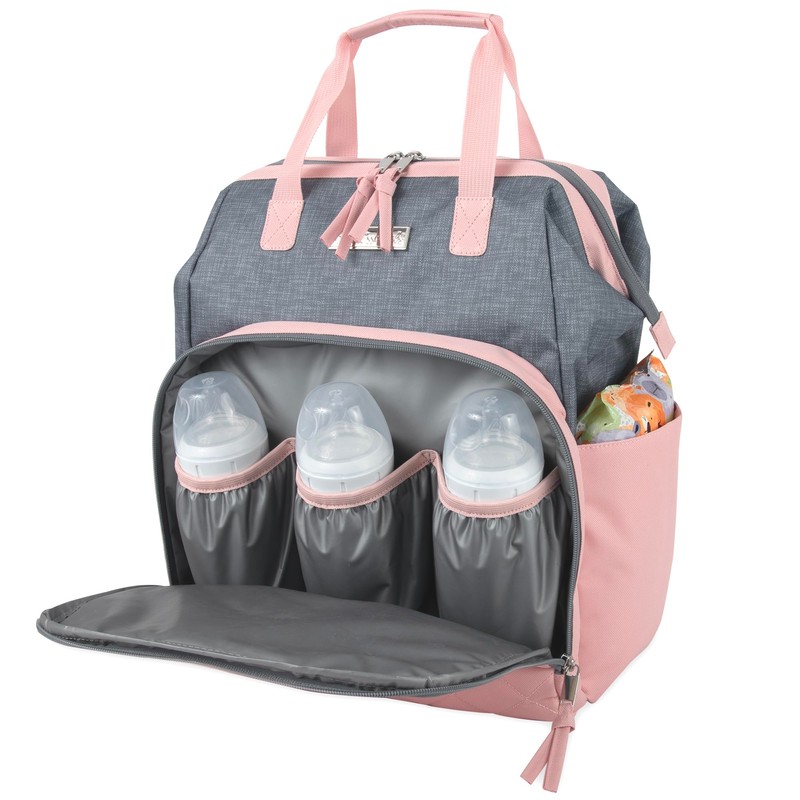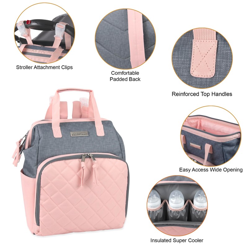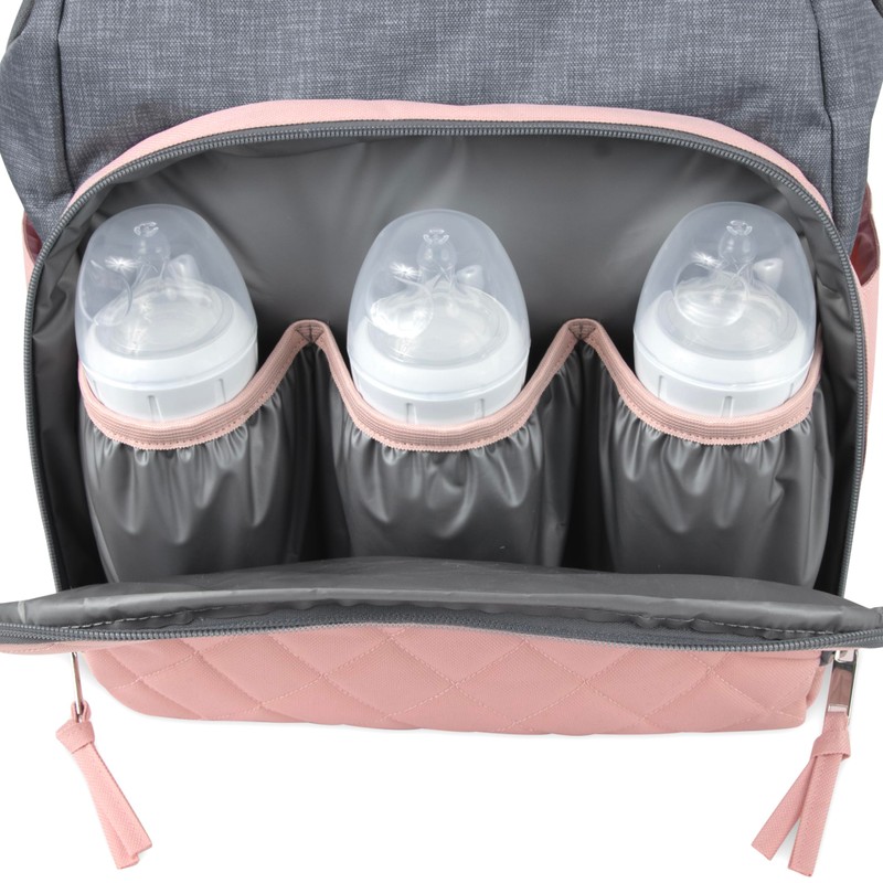 - QUILTED DIAPER BAG: Designed with moms and dads in mind, this diaper bag backpack tote is modern, stylish, and offers pockets for everything parents and babies need on the go! Quilted diaper bag’s side pockets hold baby wipes, baby powder, lotions, water bottles, umbrellas and more! Front pocket interior contains 3 insulated bottle pocket that can fit up to (3) large baby feeding bottles within.