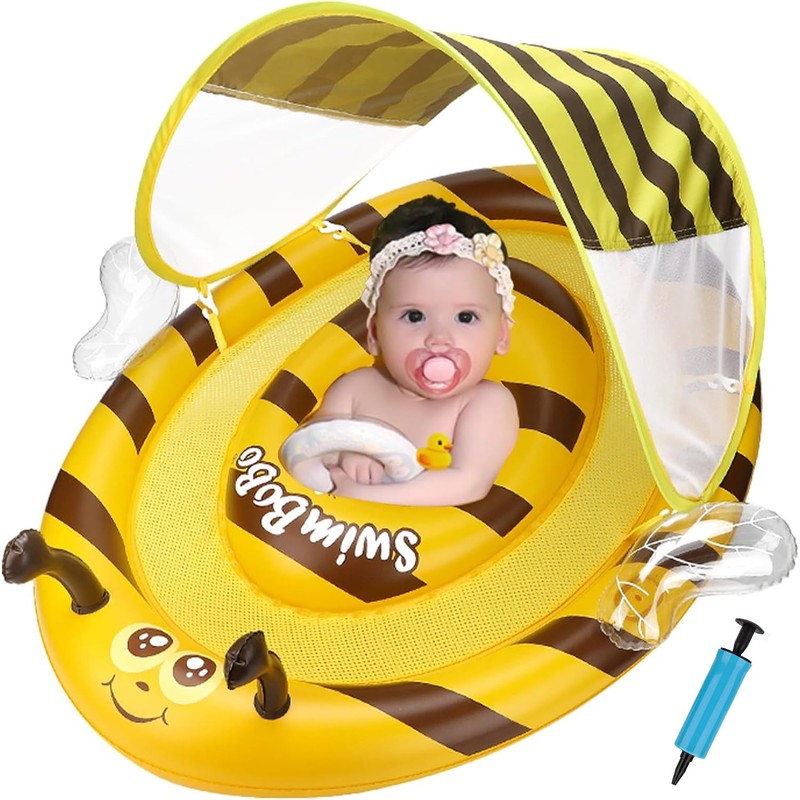 - 【Unique Attractive Design and UPF 50+ Detachable Sun Shade】 Equipped with a bee baby float, removable / adjustable canopy. Achieve UPF 50+ sun protection to better care for your baby's growth. Foot float allows kids to swim or play in the pool