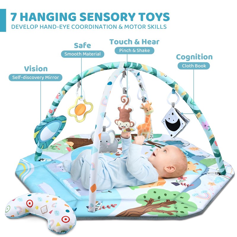 Baby Gym Play Mat, 8-in-1 Tummy Time Mat & Ball Pit with 6 Toys, Washable Baby Activity Play Mat for Visual, Hearing, Sensory, Motor Development, Baby Toys Gift for Toddler Infant 0-3-6-9-12 Months