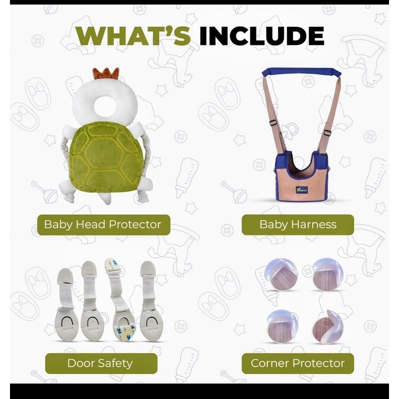 • PROTECT YOUR LITTLE ONE: Our baby head protector is designed to keep your baby's head safe and secure while on-the-go. With our baby walker harness, the 4 child safety locks, & the 4 table corner protectors you are adding the extra safety to your baby's new journey.