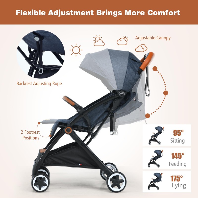 - Multiple Adjustable Stroller: We combined flexible adjustment with this baby stroller. The backrest can be adjusted from 95- 175, offering your baby the right position for sitting or lying. You can also make a corresponding adjustment of the footrest for the most comfortable position. What's more, the telescopic canopy meets the needs of different weather conditions.