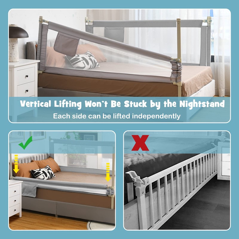 - [ Independent Vertical Lifting ]: Different from other swing-down safety bed guards, ours features vertical lifting design which won’t be stuck by the nightstand. Even better, each side can be lowered or lifted independently, making it easier for kids to get in and out of bed. The double-lock system is designed to prevent baby from accidentally pressing the lifting button.