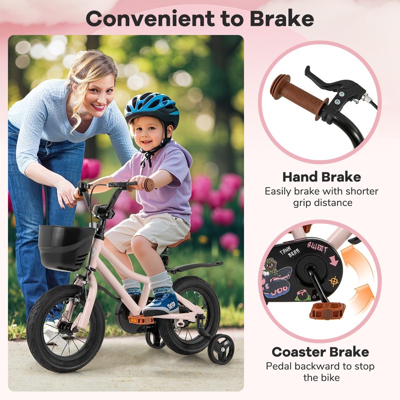 - Dual Brake System & Training Wheels: The training bicycle is equipped with dual brake system: hand brake for kids to easily brake with shorter grip distance and coaster brake to pedal backward to stop the bike. Fully enclosed chain guard prevents accidental clamping to ensure riding security. Plus, it also comes with 2 detachable training wheels for beginners to better keep balance.