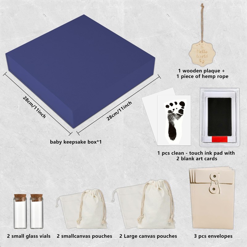 - Baby Keepsake Box Set :Our keepsake box contains 1 handprint kit, 1 milestone disc, 4 canvas bags, 3 envelopes, and 2 small glass vials. It meets all your needs for quickly and easily organizing, creating keepsakes, and collecting your baby's mementos!