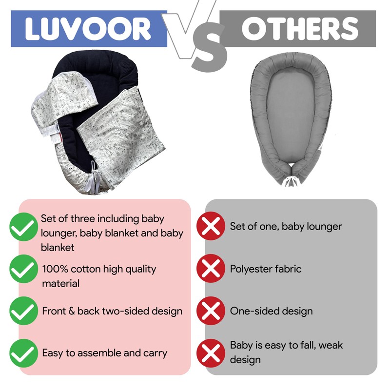 - BABY LOUNGER SET: Baby Nest, Baby Blanket, Baby changing pad. 3 items in one pack. Made of 100% cotton fabric, the set is breathable and offers a soft touch that is skin-friendly. Machine washable for cleanliness, it retains its softness and color even after multiple washes. Baby changing pad provides environment cleaning with its waterproof feature.