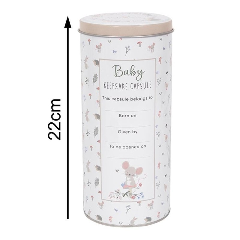 - The baby keepsake capsule is a charming gift, presented in a cylindrical tin containing a variety of sentimental items, including a keepsake box, photo album, milestone book, and special envelopes.