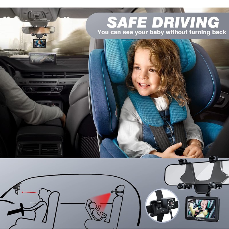 - 【DRIVING SAFETY】- The monitor can be installed under the rearview mirror, and you can clearly see your baby while looking at the car from behind. No need to take up the rearview mirror to see your baby, which enhances driving safety and greatly helps you focus on driving.