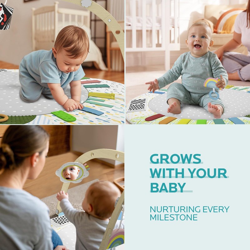 • Premium Comfort & Safety: Play Gym Activity mat Crafted from ultra-soft, skin-friendly fabric that's gentle on delicate skin, and a sturdy play gym frame made with 100% baby-safe, sustainably sourced wood. Rest assured, this activity mat provides a secure and comfortable environment for hours of exploration and playtime