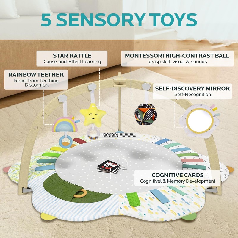 Give your baby the best start with the Baby Play Gym! Designed with five developmental zones – Focus Learning, Touching, Recognizing Colors, Hearing, and Hiding & Finding – this activity center fosters exploration, growth, and strengthens essential skills from newborn to toddler. Six detachable toys, including a Montessori high-contrast ball, self-discovery mirror, rainbow rattle, star teether, and cognitive cards, stimulate motor skills and sensory development. Our tummy time mat also comes with a guidebook featuring expert-developed tips and activities tailored to your baby's developmental needs. Crafted from high-quality, baby-safe fabrics with a luxuriously thick texture, the mat provides a comfortable and safe space for your little one to play and explore. The sturdy wooden toy bar is made from 100% baby-safe materials, ensuring durability and peace of mind. Parents will appreciate the convenient setup and care. The play gym assembles and disassembles in under two minutes without tools, making it ideal for travel and storage. The machine-washable play mat ensures a clean and hygienic environment for your baby. Featuring a charming rainbow and cloud pattern, the Baby Play Gym adds a touch of whimsy to any nursery decor. This thoughtful and delightful gift is perfect for new babies and parents, combining beauty and functionality to create a cherished space for learning and play